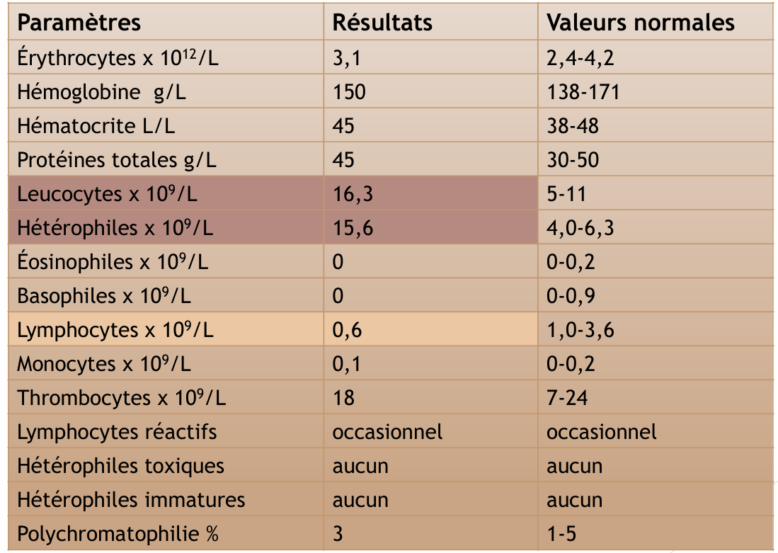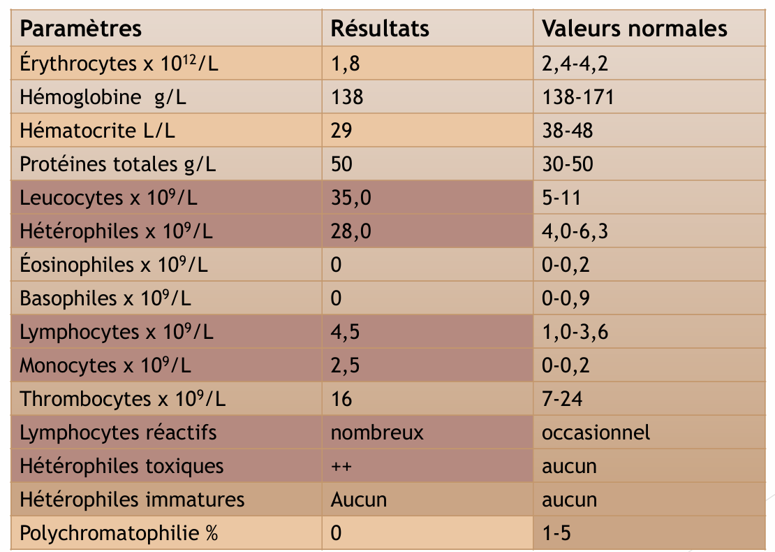 a) La présence d’hétérophiles toxiques avec un comptage d’hétérophiles normal suggèrent une infection sévère