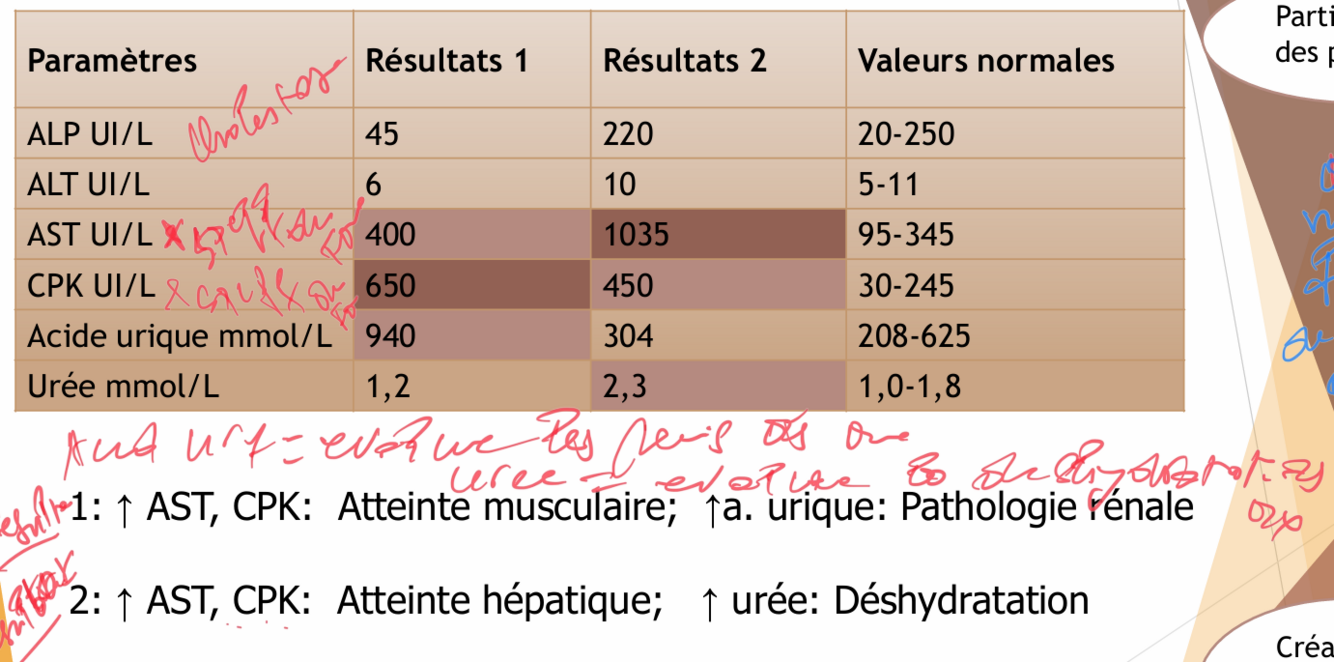 Créatine kinase (CK)-Présente dans le cœur, les muscles squelettiques et les tissus nerveux -Utile pour déterminer si une élévation de l’AST est secondaire à un dommage