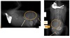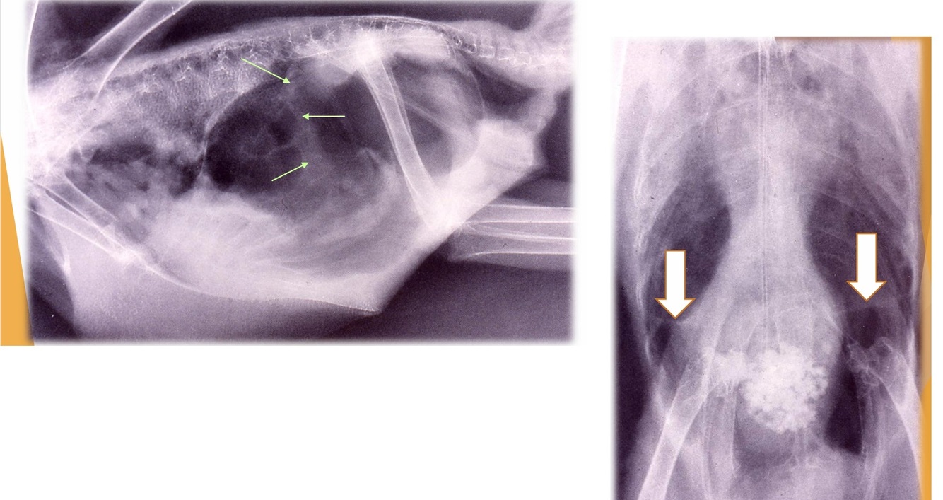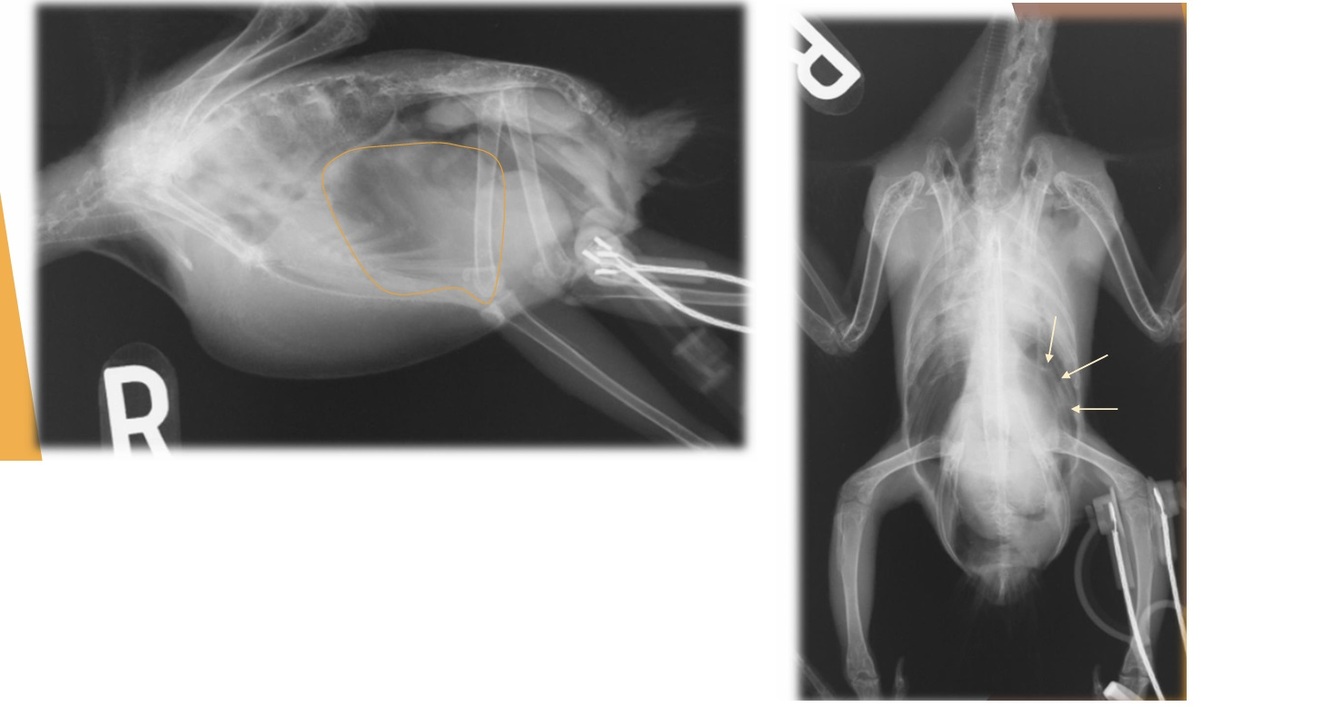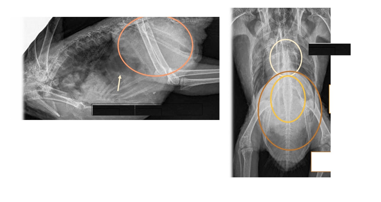 Une perruche ondulée femelle de 11 ans est présentée pour une boiterie de non-appui de la patte droite depuis quelques jours. Le propriétaire rapporte que l’oiseau est tombé de son perchoir un peu plus tôt en tentant de se déplacer. À l’examen, l’oiseau appui son métatarse sur le dessus du perchoir. Aucune enflure ou hématome visible au niveau de ce membre. Le réflexe de retrait est diminué mais la douleur profonde est toujours présente. Les radiographies ne démontrent pas d’anomalies squelettiques, mais une densité de tissu mou est visible dans le coelome dorsal juste ventralement à l’articulation coxofémoral.