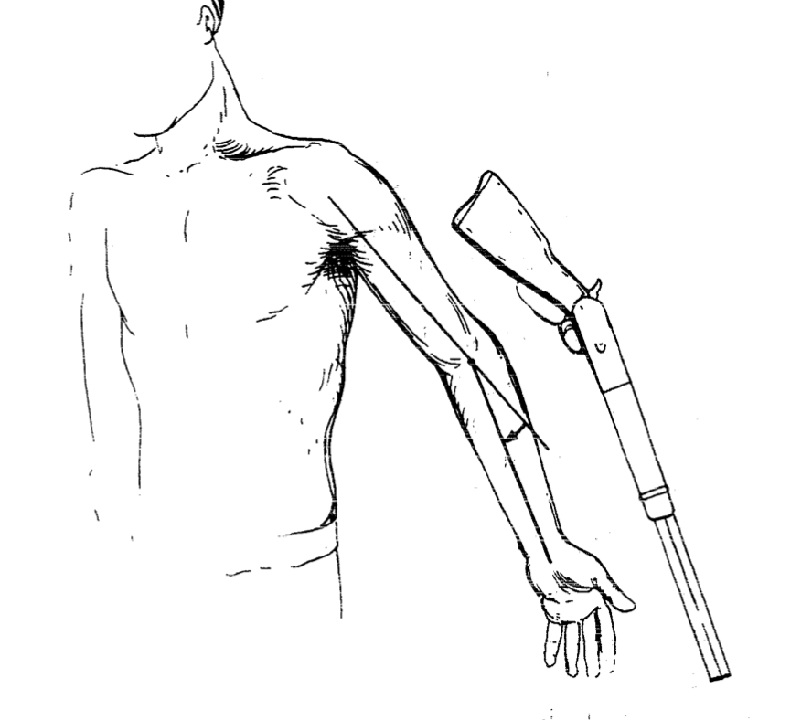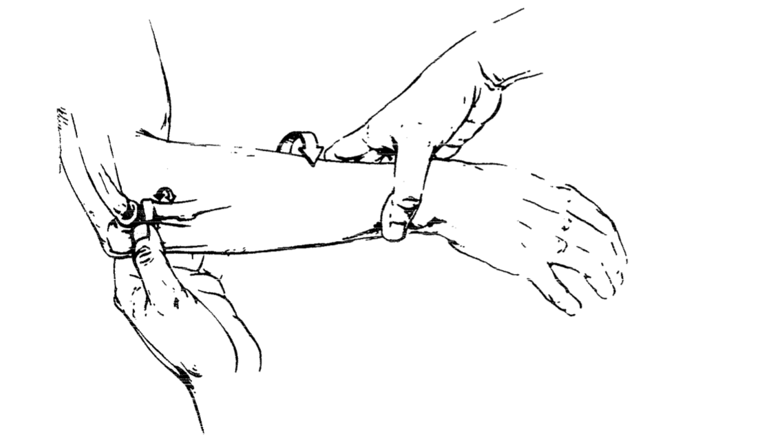 Una mano ahuecada en olécranon haciendo aducción, la otra en muñeca