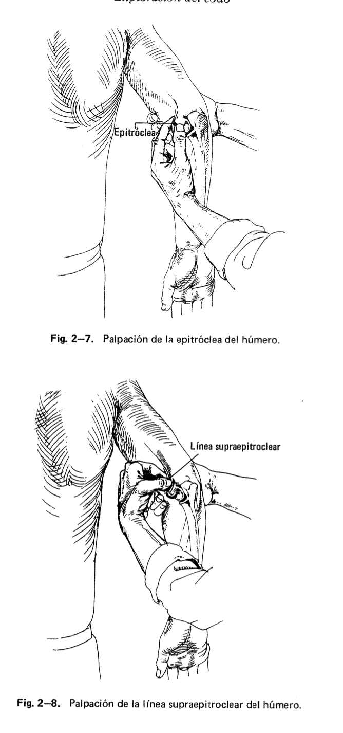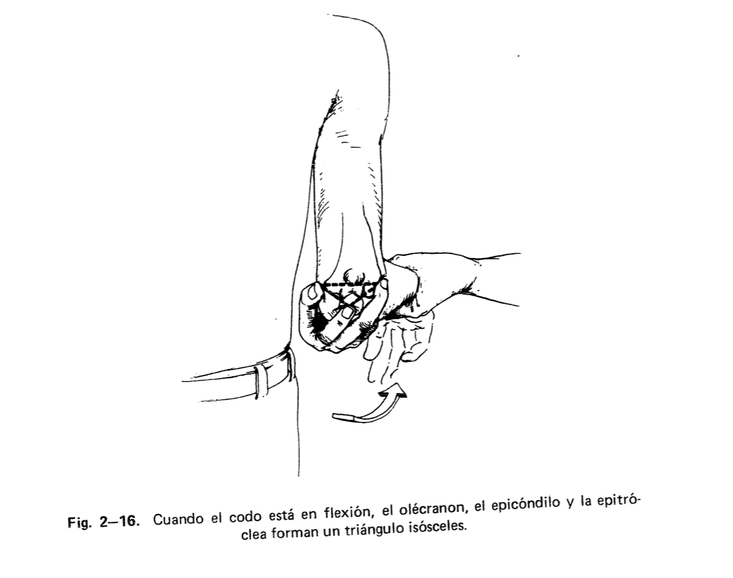 Para explorar la integridad del codo utilizamos la simetría de estas tres estructuras, en las cuales se pueden colocar los dedos y forman un alínea recta en extensión y un tríangulo isóceles en flexión