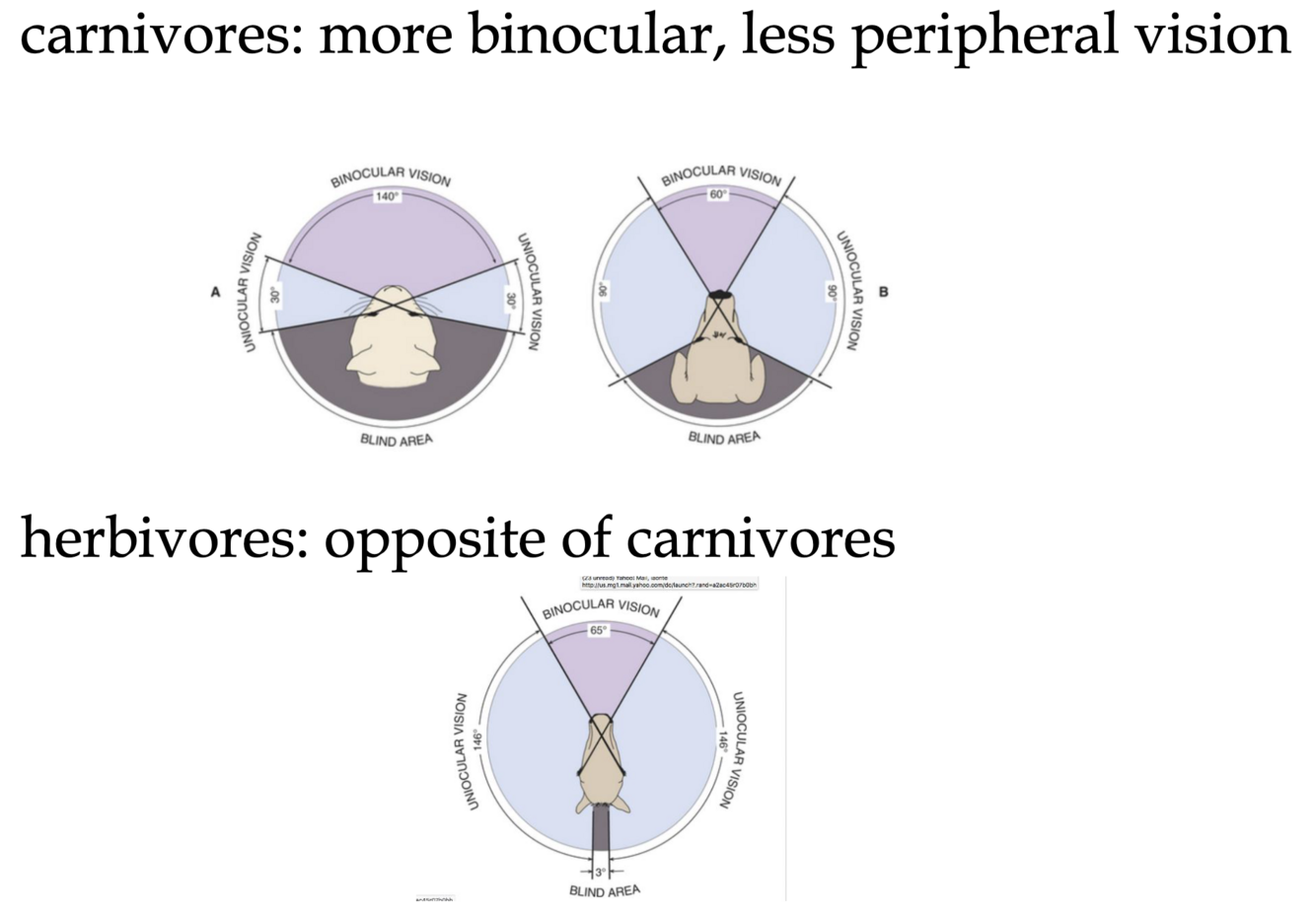 Describe the vision of carnivores/predators vs. herbivores/preys relative to binocular and peripheral vision/