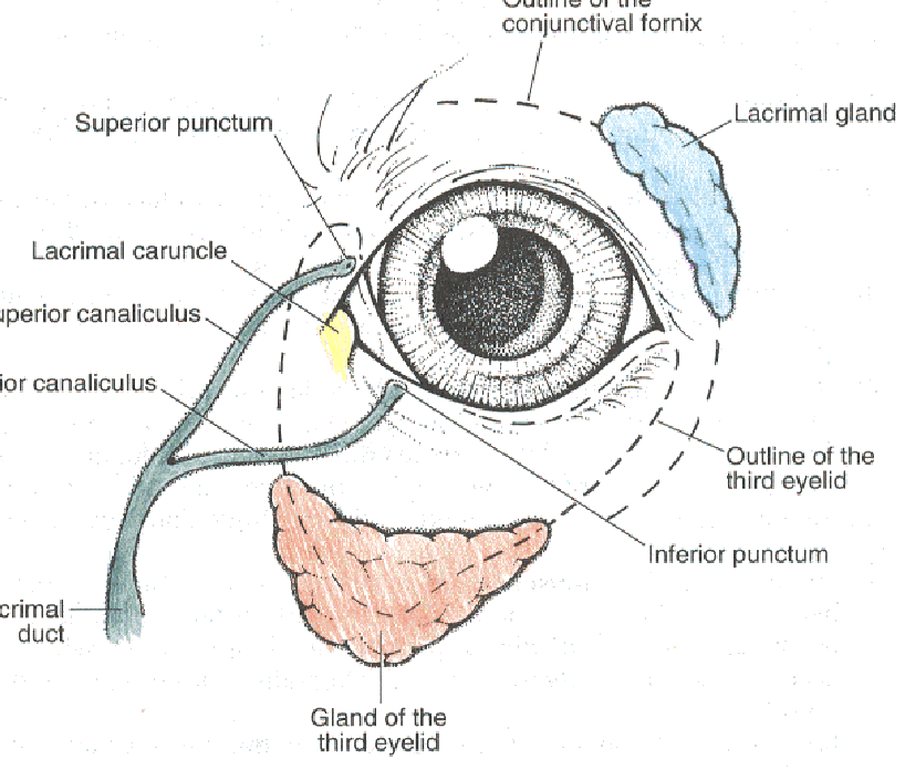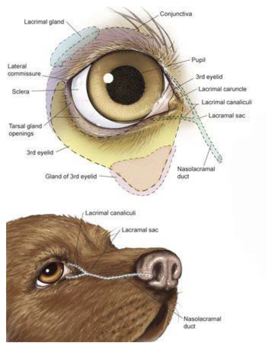 lacrimal duct (dorsolateral to eye) -> tears move over eye -> Medial canthus -> superior & inferior lacrimal puncta -> lacrimal canaliculli -> nasolacrimal duct system -> nasal vestibule