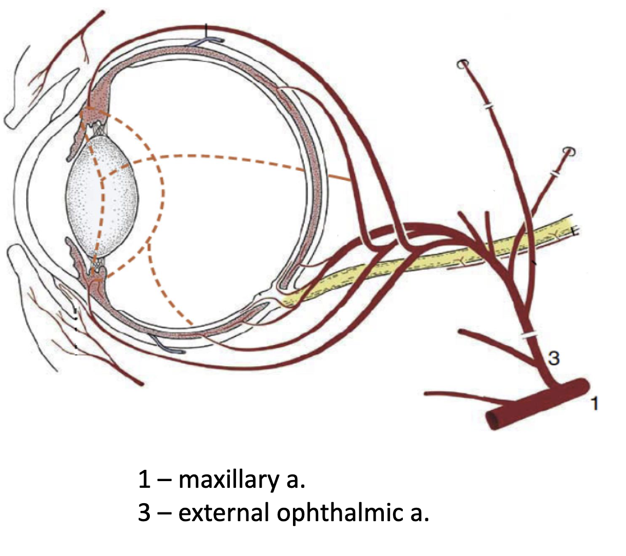 (external carotid -> maxillary a. -> external ophthalmic a.)