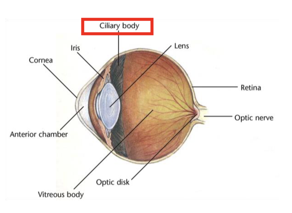 CILIARY BODIES via relaxing the suspensory ligg. of the lens (ZONULAR FIBERS) that attach onto lens capsule – innervated by PARASYMPATHETIC nerve fibers