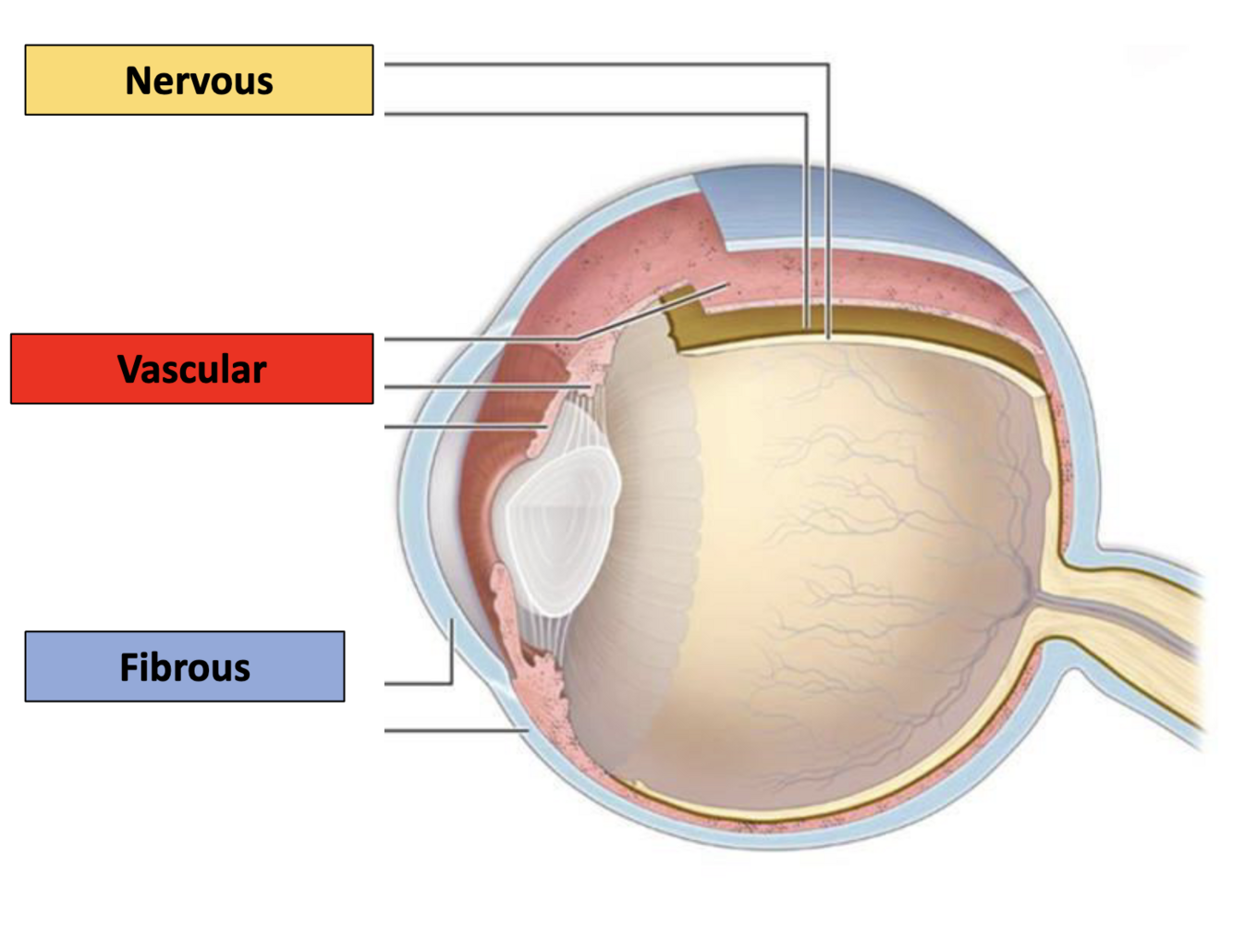 Fibrous tunic (external) -> vascular tunic (uvea/middle) -> nervous tunic (internal)