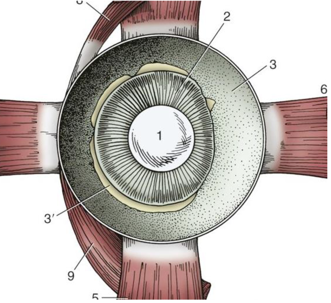 Cornea projects from the sclera; distinctly demarcated form sclera @ corneoscleral junction (limbus)