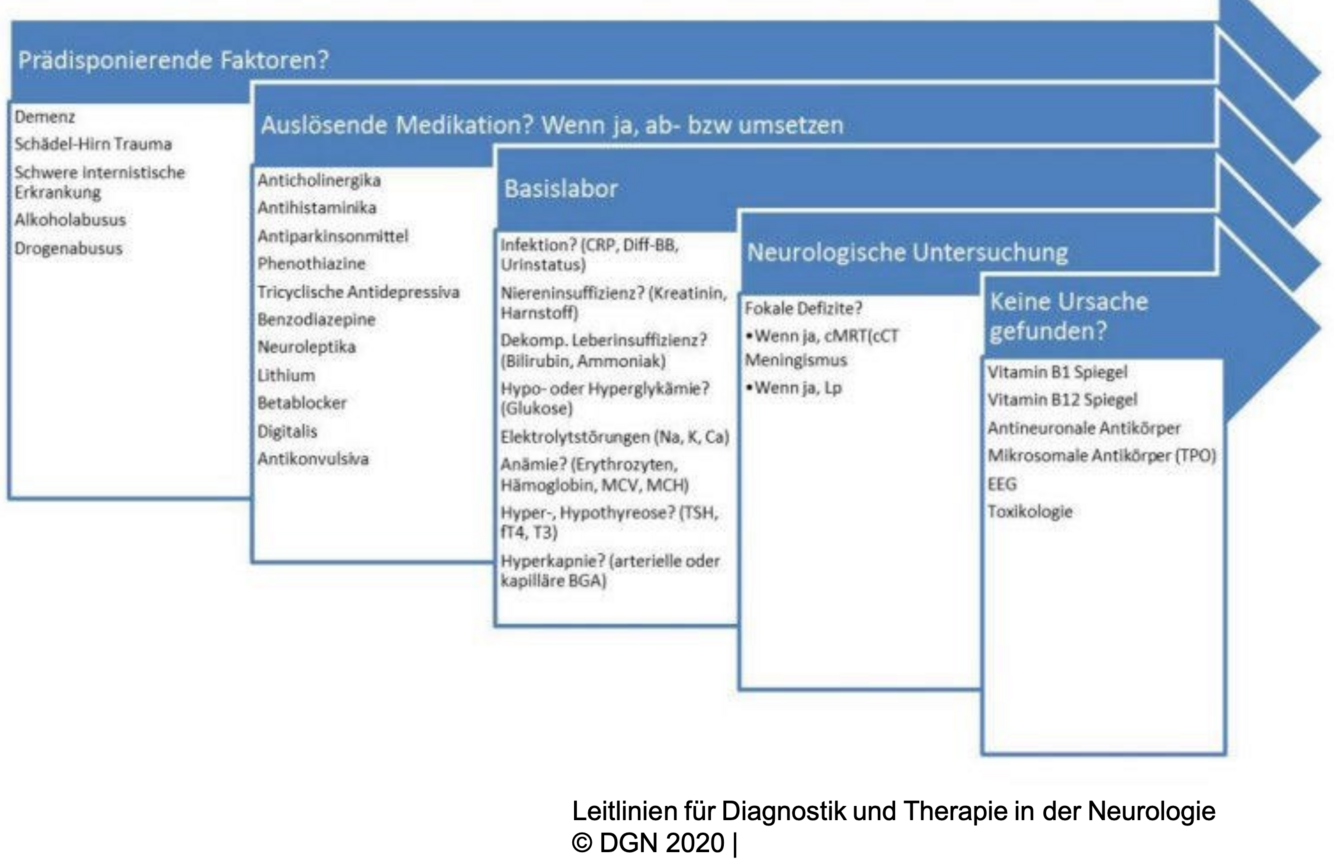 Erweitertes Labor: je nach Befund v. Notfalllabor: Blutkulturen, Magnesium, TSH, VitB1, VitB12, Folsäure, Drogenscreening, Med-Spiegel, (TPHA, ANA?)