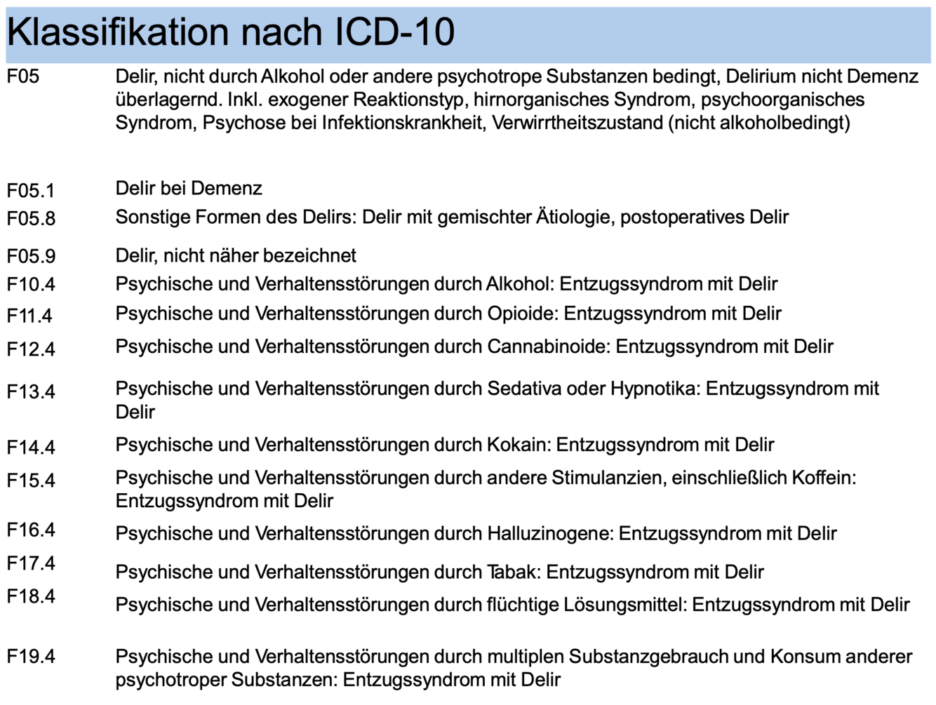 * ICD-10: Delirium wird unter der Kategorie “F05 - Delirium, nicht durch Alkohol oder andere psychotrope Substanzen bedingt” klassifiziert.