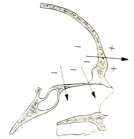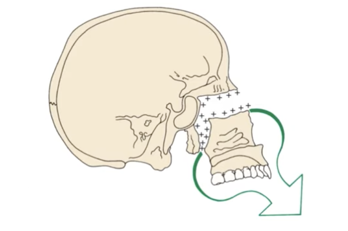 Describe the direction in which the maxilla grows in relation to the cranial base
