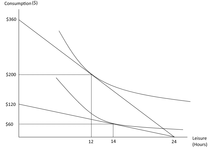 14; 12. The flatter budget constraint corresponds to a wage of $5/hour since a worker who chooses to work all 24 hours in a day (and take 0 hours of leisure) stands to make $5/hour x 24 hours, or $120, which is where the flatter budget constraint line intersects the vertical axis. The optimal choice of leisure is given by the point of tangency between the budget constraint and indifference curve, which occurs at a leisure level of 14 hours for this budget constraint. The steeper budget constraint corresponds to the higher wage of $15/hour and is tangent to the indifference curve at a leisure level of 12 hours.