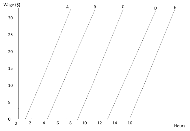In the graph below, there are five potential labor supply curves, each labeled with a letter from A to E.