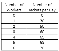 10 jackets. When the third worker is hired, the number of jackets produced per day rises from 50 to 60, a change of 10. Hence, the marginal product of the third worker is 10.