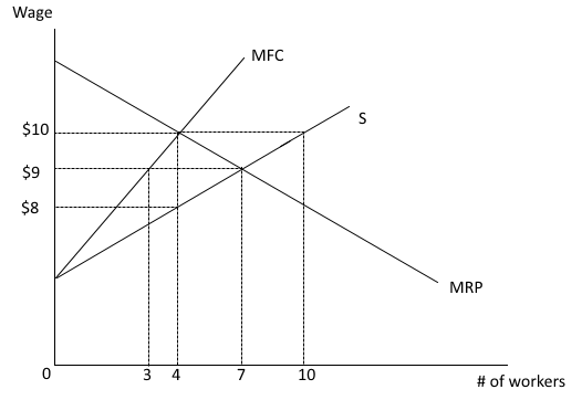 4 workers; $8 wage. A monopsonist (and any firm) maximizes profit by choosing a quantity of labor such that marginal cost (MFC) is equal to marginal revenue (MRP). Here, that occurs when there are 4 workers. Because the firm is a monopsonist and the marginal cost curve is above the supply curve, the wage is not determined by the intersection of MFC and MRP. For a monopsonist, the marginal cost of an additional worker is not only the wage that must be paid to that worker, but also the poisoning effect of the raise the firm must give to all the existing workers. To find the wage needed to hire 4 workers, we need to use the labor supply curve which tells us the wage required to hire 4 workers is $8.