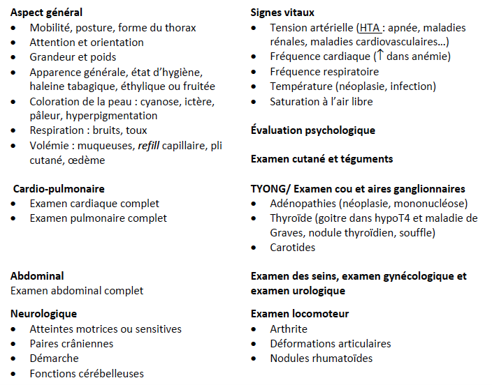 Les signes vitaux sont vérifiés en cas de fièvre, de tachycardie, de tachypnée et d’hypotension. L’examen général doit être particulièrement complet, et comprendre l’aspect général et l’examen du cœur, des poumons, de l’abdomen, de la tête et du cou, des seins, du rectum (dont l’examen de la prostate et la recherche de sang occulte), des organes génitaux, du foie, de la rate, des ganglions lymphatiques, des articulations et de la peau.