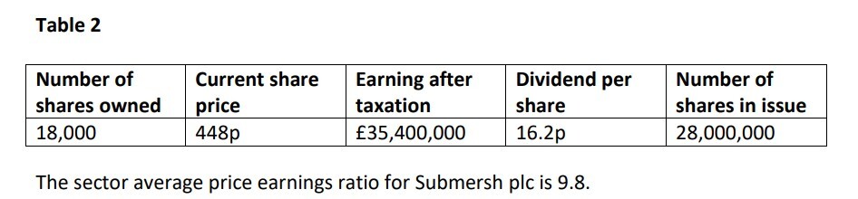 Calculate, showing all your workings, the price earnings (P/E) ratio for Submersh