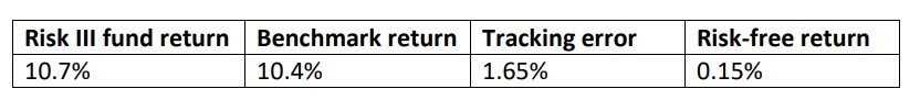 Comment on what can be deduced about Risk III fund’s performance based upon the information ratio figure from your answer 0.18