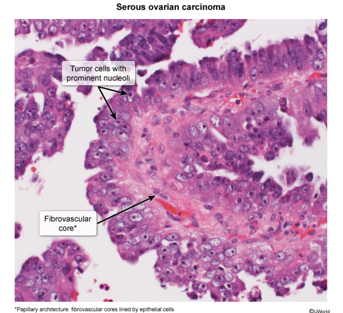 ***Most common ovarian cancer *** Often bilateral ↑ CA-125 Histology: Psammoma bodies/ anaplasia/ invasion into the stroma/ papillary formations/ cellular atypia/ fibrous core