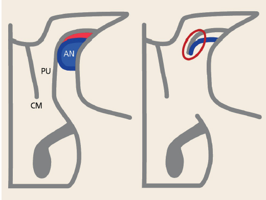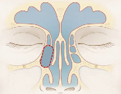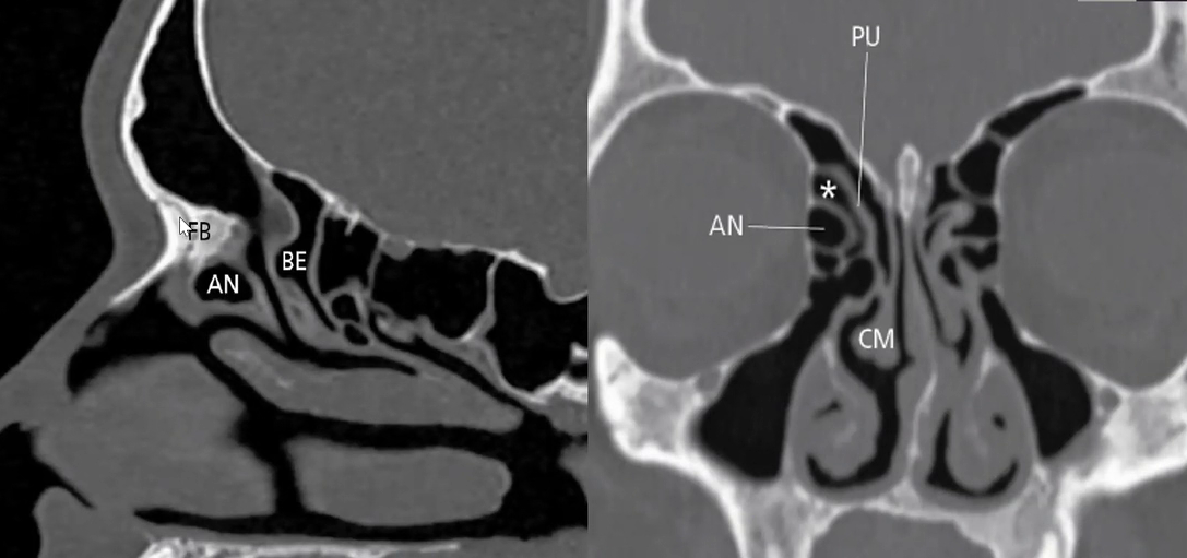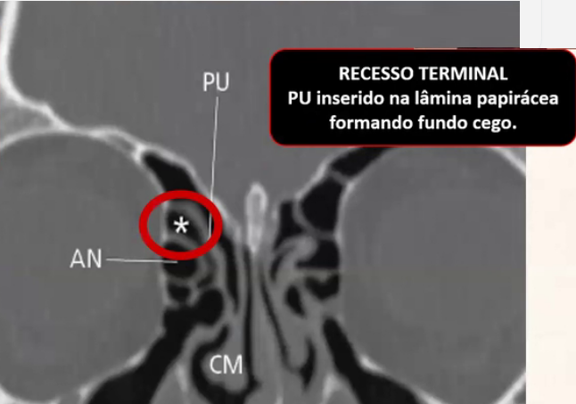 É um fundo cego (asterisco na imagem) formado pela inserção do PU na lâmina papirácea (situação mais prevalente). A drenagem do frontal se dá no meato médio.