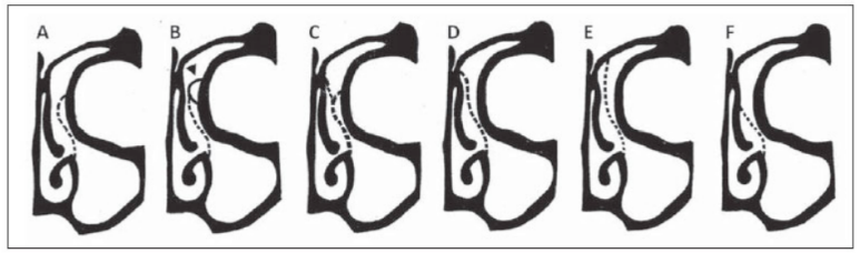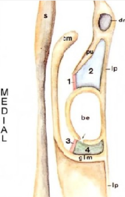(Acima da bula , conectada à base do crânio, passa pelo recesso e ATINGE O INTERIOR DO SEIO FRONTAL).