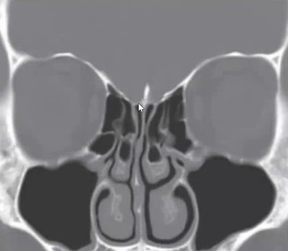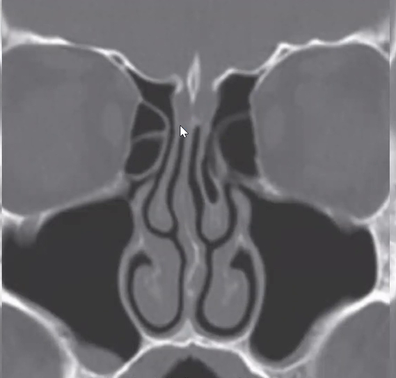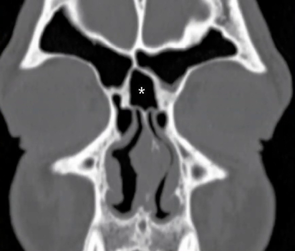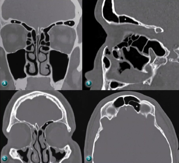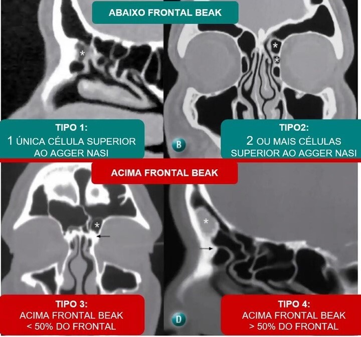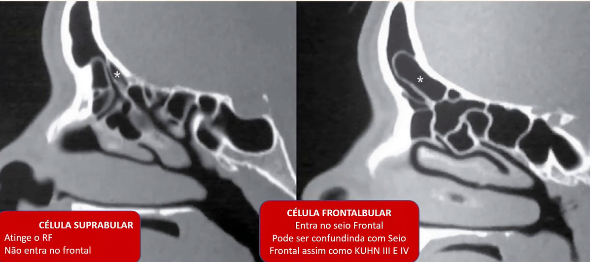 (Pneumatiza o septo interssinusal frontal, geralmente relacionadas a apenas um RF, mas pode drenar dois RF. Podem associar-se a pneumatização da Crista galli. Identificada em cortes coronais ou axiais).