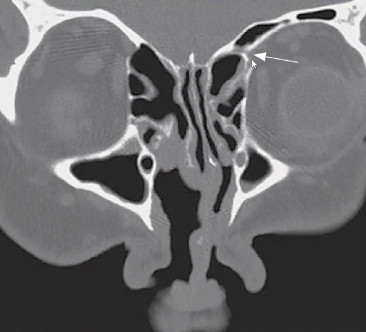 Todo cuidado deve ser tomado com a artéria etmoidal anterior medialmente, porque as paredes ósseas ali são muito finas e a dura-máter muito aderida a elas (risco de fístula). E o limite lateral do canal ósseo dela penetra na órbita (risco de lesar lamina papirácea).