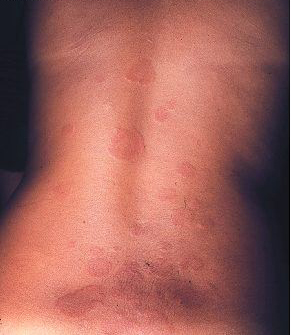 Lesiones eritematosas, serpinginosas y maculares, con centro pálido que no producen prúrito.