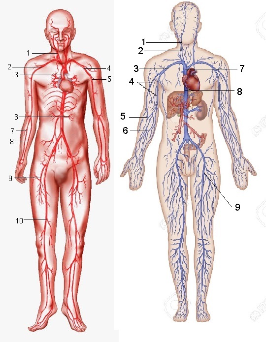 Identify the ten arteries. Identify nine veins.