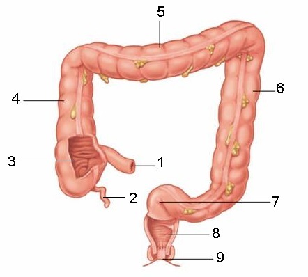 aka colon; 0% of total digestion; reabsorbs salt and water