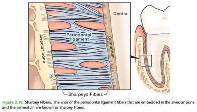 Sharpey fibers are a part of the collagen fibers from the periodontal ligament that are each partially inserted into the outer part of the cementum at 90 degrees or perpendicular to the cemental surface (as well as the alveolar process on their other end) as they are inserted on the other end, the alveolar process.