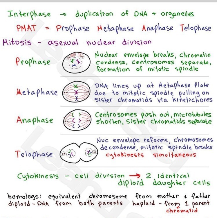 Mitosis: Interphase→Prophase→Metaphase→Anaphase→Telophase