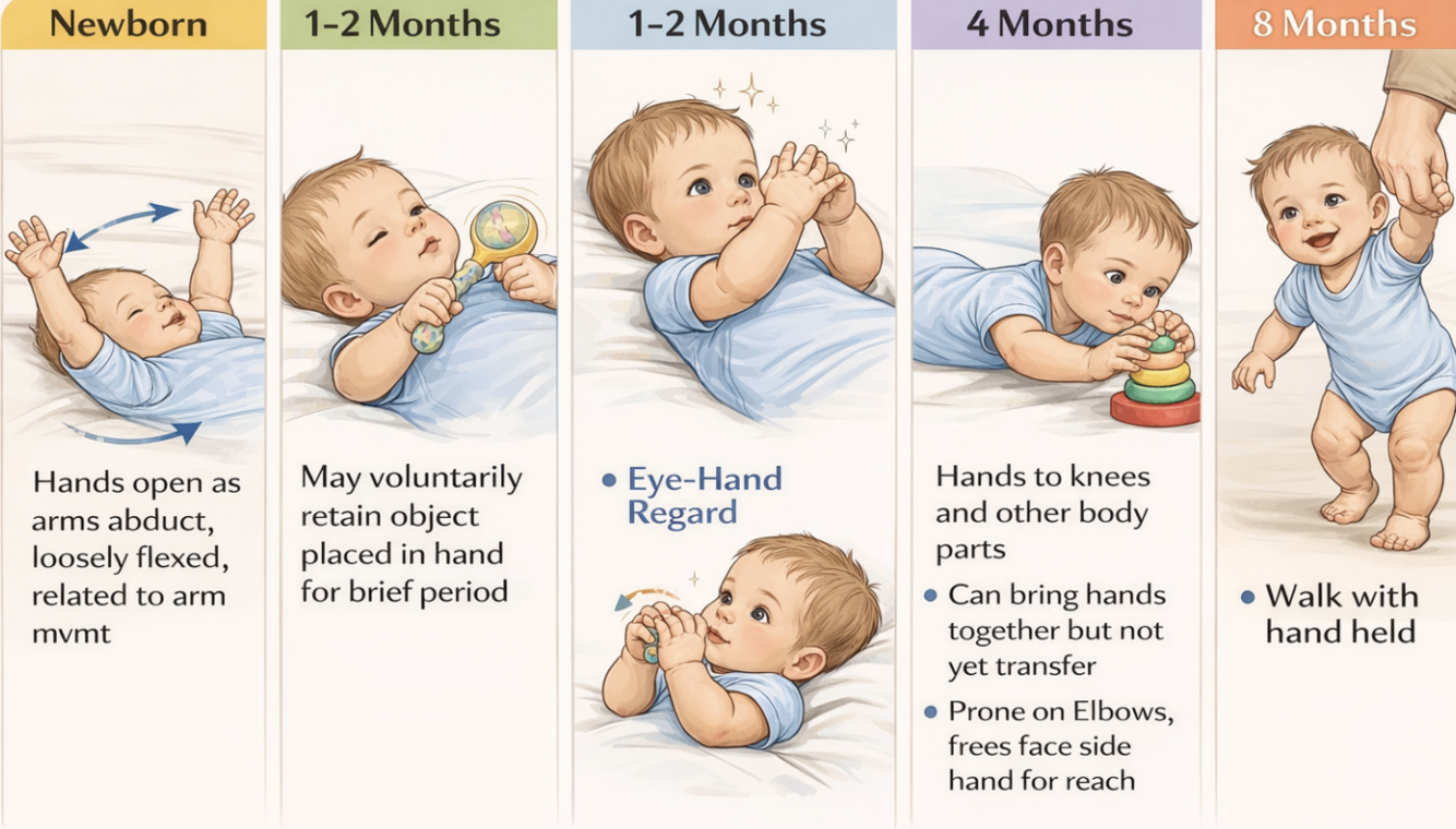 1-2 months: May voluntarily retain object placed in hand for brief period