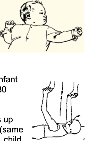 Newborn: Hands open as arms abduct, loosely flexed, related to arm mvmt