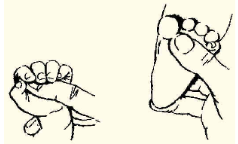 Pressure placed in the palm/ foot causes the fingers to flex and tightly grasp the object.