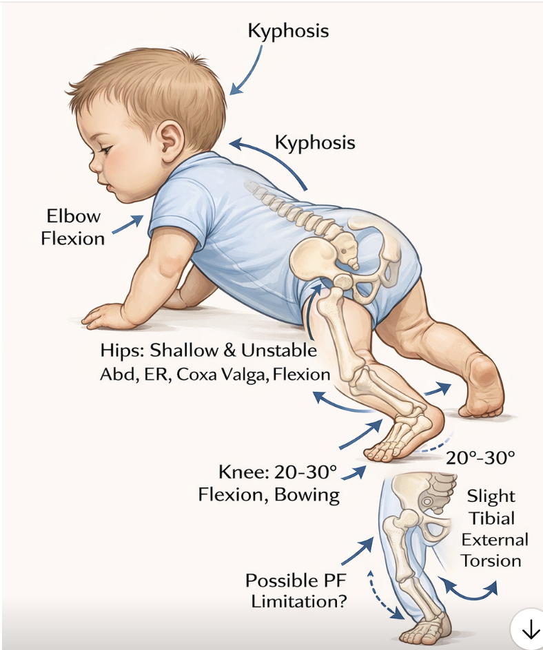 -Hips shallow and unstable, abd, ER, coxa valga (pic), flexion