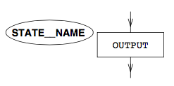 A rectangle containing the active outputs with an ellipse to the top left containing the state name.