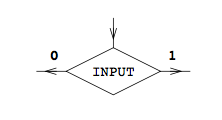 With a diamond box containing the variable (input) and a path for each outcome 0 or 1.