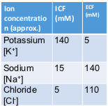 What are the extracellular and intracellular concentrations of potasium, sodium and chloride?