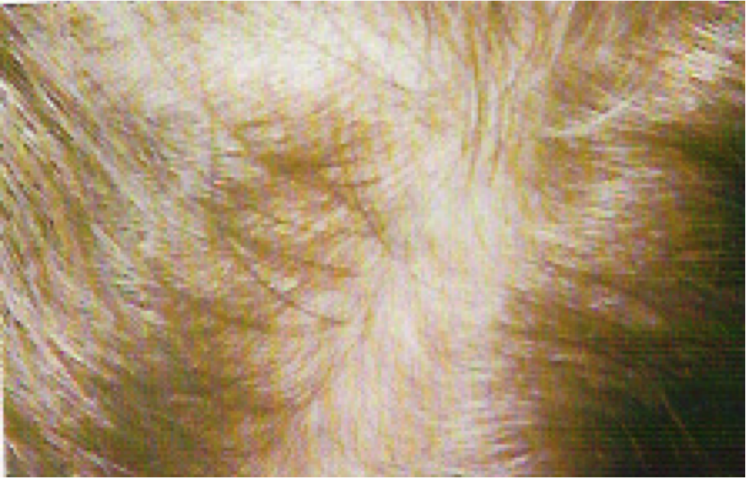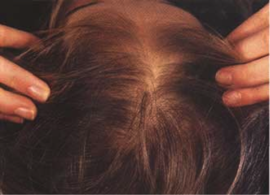no areas of total alopecia, no scarring, and no sign of an inflammatory scalp dermatitis