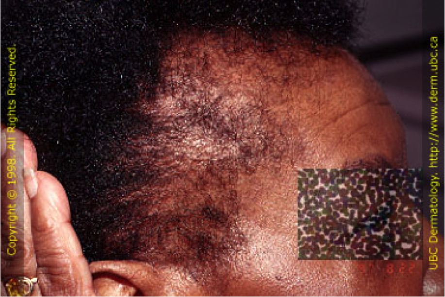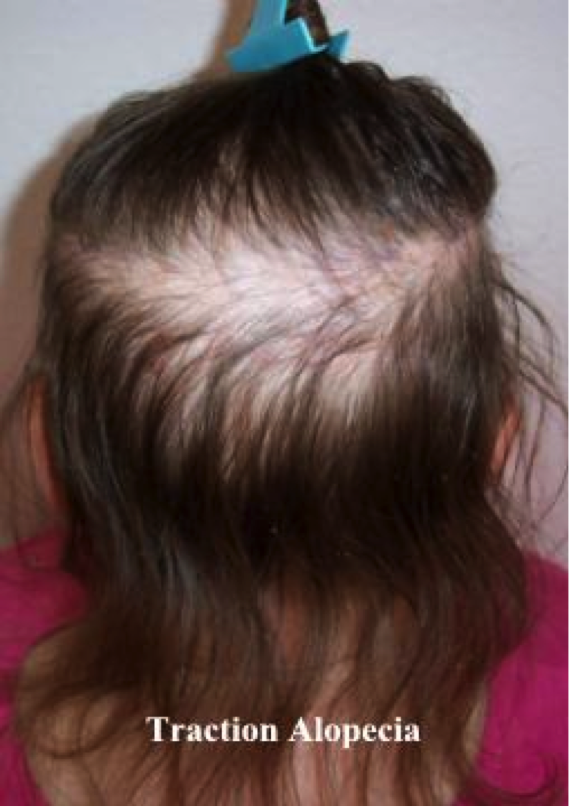 patterns of hair loss: temporal area with tight ponytails/curlers; occipital area with tight buns; the area adjacent to the region that is braided with cornrowing.
