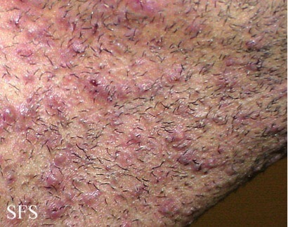 A foreign body inflammatory reaction; often referred to as razor bumps or ingrown hairs
