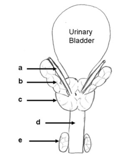 Within this schematic picture, which structure best represents the position of the bulbo-urethral glands?