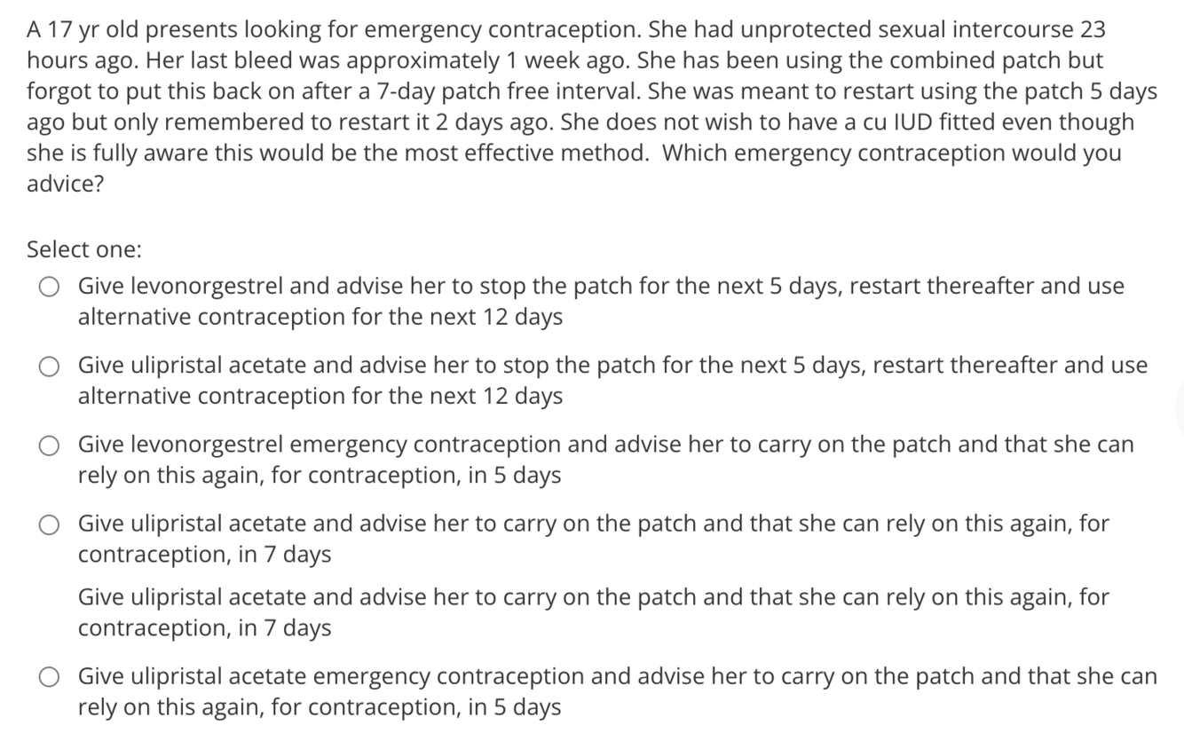 She has already had 2 days of the new patch cycle and therefore can’t take UPA-EC (ellaone), she needs another 5 days for it to become effective again