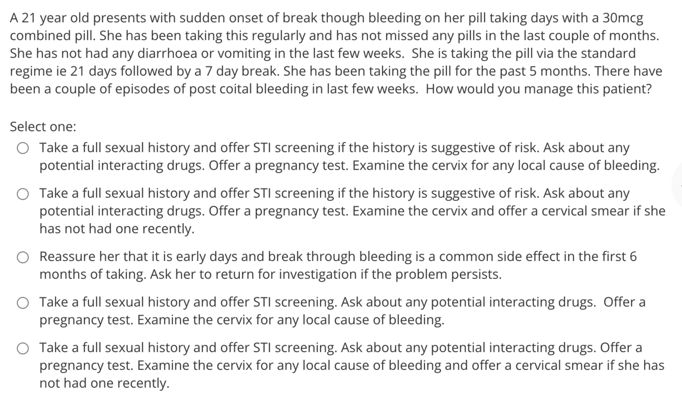 The correct answer is: Take a full sexual history and offer STI screening. Ask about any potential interacting drugs. Offer a pregnancy test. Examine the cervix for any local cause of bleeding.