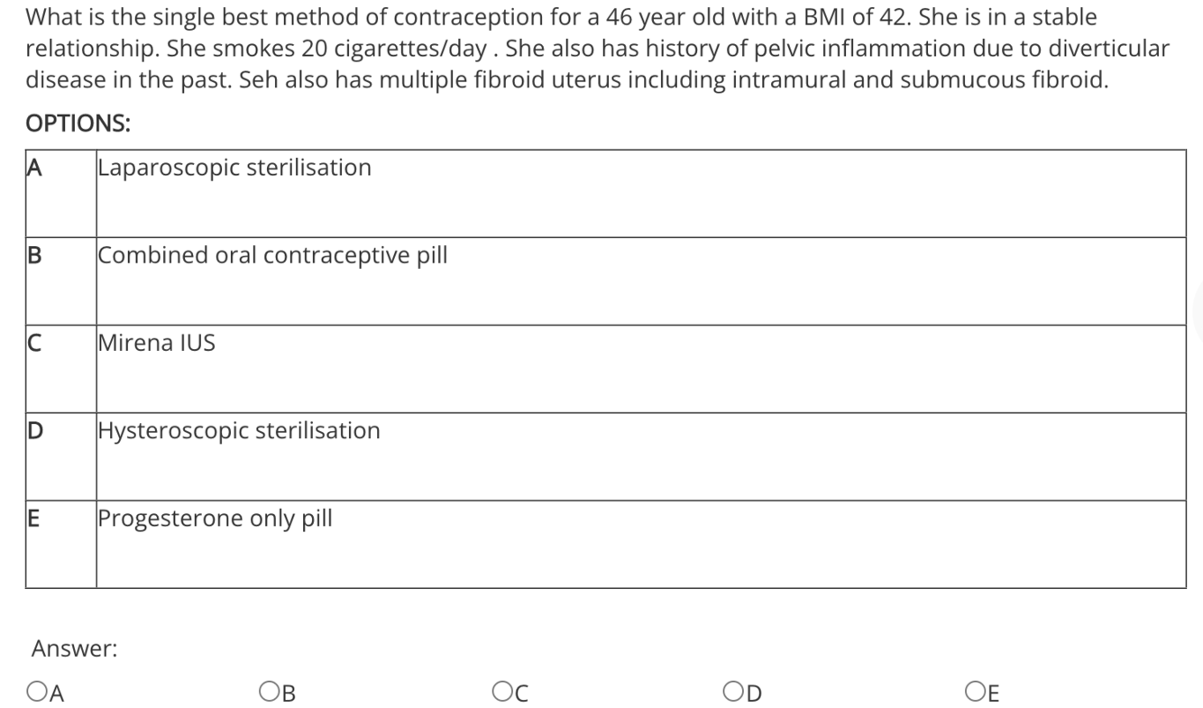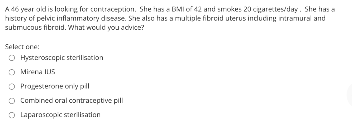 Given her previous history, sterilisation will be risky. Difficult to fit Mirena and Hysteroscopic sterilisation with fibroid uterus. COCP Contraindicated in a women above 40 and with high BMI