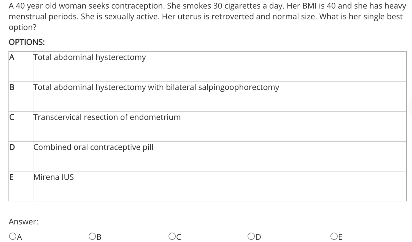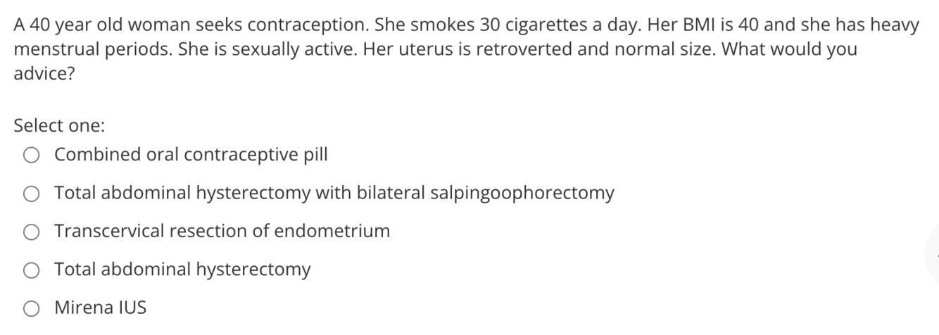 Nice recommends Mirena as a the first choice. Surgery has high risks. TCRE does not provide contraception. COCP is contraindicated in a smoker with high BMI