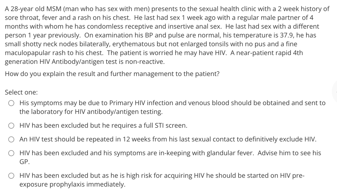 The correct answer is: His symptoms may be due to Primary HIV infection and venous blood should be obtained and sent to the laboratory for HIV antibody/antigen testing