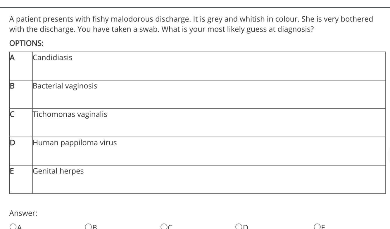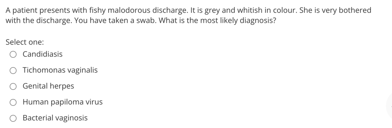 The correct answer is: Bacterial vaginosis