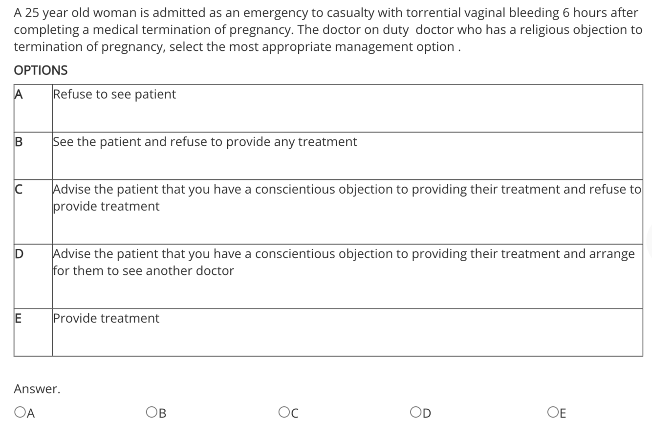 The correct answer is: Treat the woman as you would anyone else in this situation, as it is an emergency