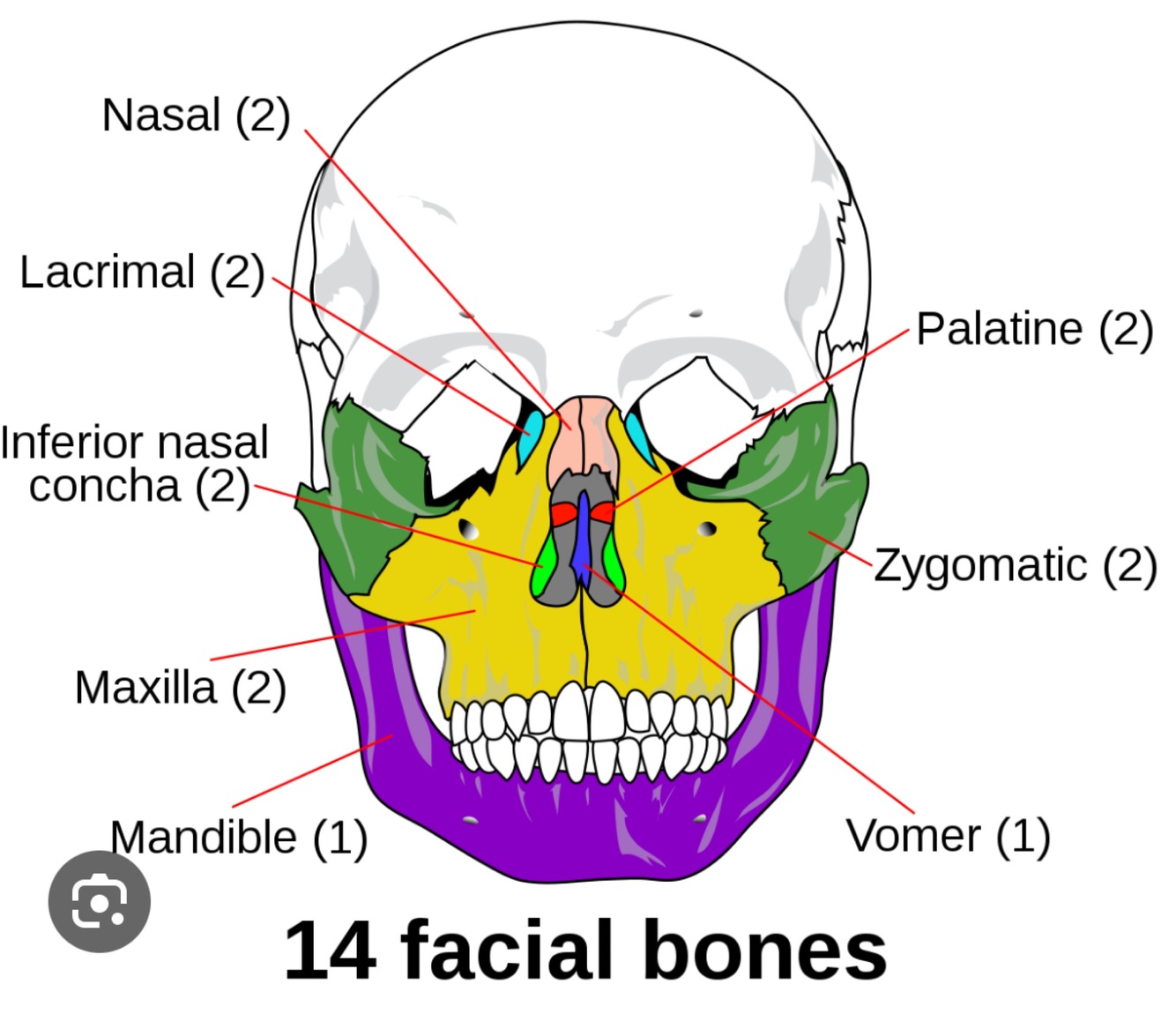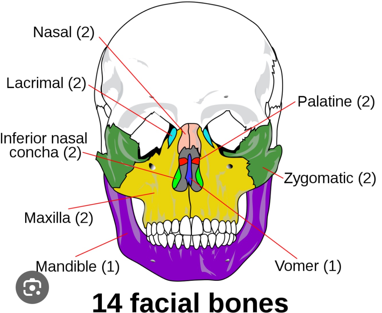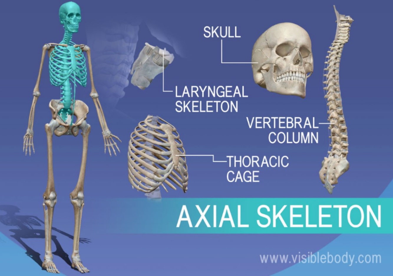 - Includes: skull (cranial and facial bones), neck, back (vertebrae), and ribcage